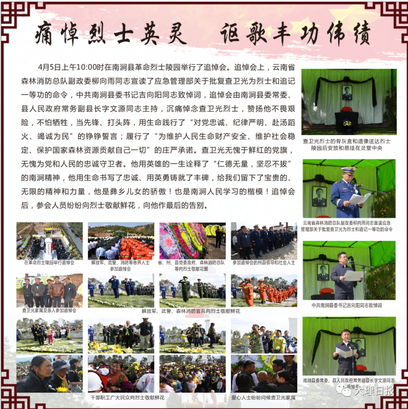 “哪有什么岁月静好,不过是有人替你负重前行。” 2019年4月5日,在南涧大涝箐车辆限超检查站所在的八角地举行了查卫光烈士骨灰交接仪式,查卫光魂归故里。“天刚亮,八角地路边已经站了许多闻讯而来的群众,他们中大多数人并不认识查卫光,都是自发而来,手捧着菊花,默默等待着送查卫光回家的车队出现。” 那个带着寒意的清晨,让参加当日采访的大理日报社记者马丽芳一直难以忘记。当日,南涧县城5万余名群众挥泪送别英雄。