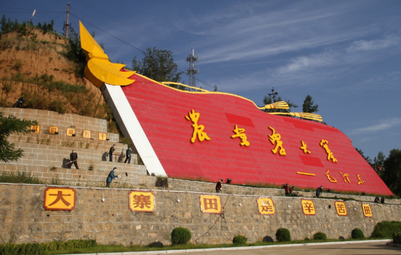 山西省晋中市昔阳县大寨镇大寨村,地处山西省晋中市昔阳县城东南部,全村有220多户人家,510多口人,1.88平方公里,海拔为1162.6米,属太行山土石山区,自然环境恶劣,群众生活十分艰苦。解放后,以陈永贵、郭凤莲等为带头人的大寨人决心改变落后的面貌。他们艰苦奋斗,治山治水,在七沟八梁一面坡上建设了层层梯田,并通过艰巨劳动引水浇地,改变了靠天吃饭的状况。因此,得到了毛泽东主席的肯定和表扬,并于1964年发出了“农业学大寨”的号召,从而成为全国农业的一面旗帜。