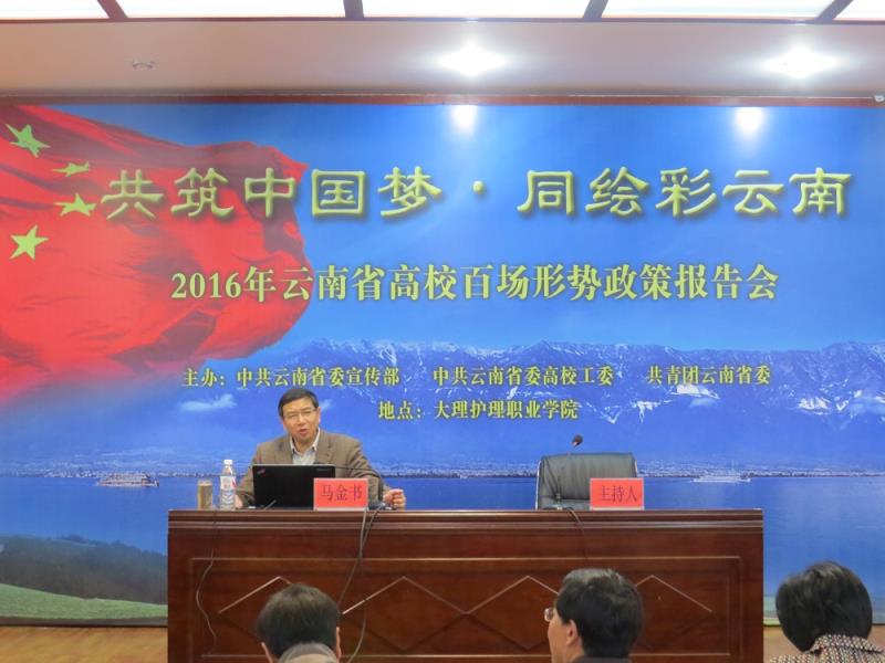 为深入学习党的十八届三中、四中、五中、六中全会精神和习近平总书记在全国高校思想政治工作会议上的重要讲话精神,树立和落实创新、协调、绿色、开放、共享的发展理念,结合云南省委高校工委关于在全省高校中开展“百场形势报告会”的工作安排,12月29日,beat365vip官网登录入口邀请云南省委、云南省高校宣讲团成员,云南省委党校副校长、云南省行政学院副院长马金书教授到校为全体教职工和部分学生代表共300多人作了“以新发展理念引领云南跨越式发展”的宣讲报告。