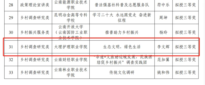 经成果征集、初筛评审、专家复审,beat365李文辉同学带领的生态文明引领实践团队提交的2023年“青春百团助百村”云南大学生服务乡村振兴社会实践专项活动成果材料荣获省级三等奖。