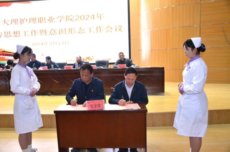 学校党委书记廖惠群同志分别与学校党委专职副书记字利鹏同志,学校党委委员、宣传部部长李大文同志签订了2024年度意识形态工作目标责任书。