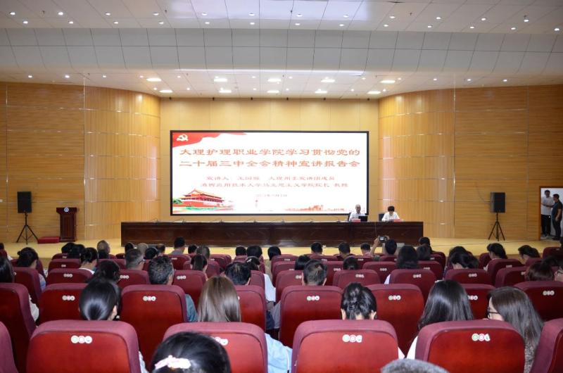 专家学者深入讲。9月4日,beat365vip官网登录入口召开学习宣传贯彻党的二十届三中全会精神宣讲报告会。大理州委宣讲团成员、滇西应用技术大学马克思主义学院院长王国强教授以《进一步全面深化改革、推进中国式现代化的重大意义和总体要求》为题对全校师生作专题宣讲。10 月31日,党的二十大代表李桂科医生以《推动全面深化改革 不断取得新成效》为题,向全校新生和老师宣讲党的二十届三中全会精神,激励医学生坚守医者初心、践行医学誓言。