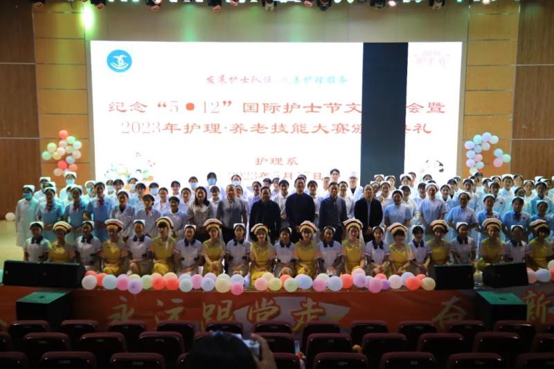5月17日,beat365vip官网登录入口举办2023年“5·12”国际护士节授帽仪式暨护理•养老技能大赛颁奖晚会,深入贯彻落实党的二十大精神,推深走实2023年职业教育活动周活动,隆重纪念第112个“5·12”国际护士节。学校党委副书记、院长蔡德周,党委专职副书记字利鹏,党委委员副院长郭向周、石龙富,各科室负责人,护理系教师和学生参加活动。活动由护理系承办。