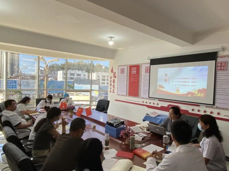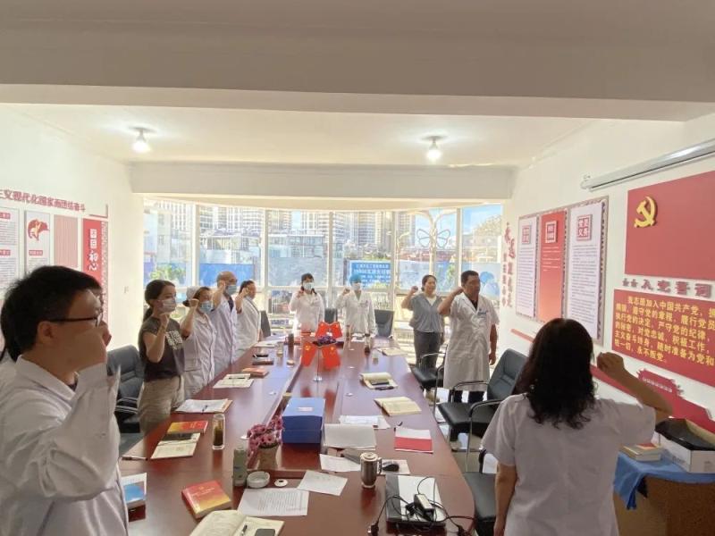 门诊部党支部书记赵丽娟同志带领门诊部全体党员重温了入党誓词,面对鲜红的党旗,党员们右拳高擎,铿锵的誓词萦绕在耳,激励着在场的每一位党员干部,坚定理想信念,立足岗位,以更加饱满的热情和奋发进取的精神投入到工作中,用实际行动为党旗增光添彩。