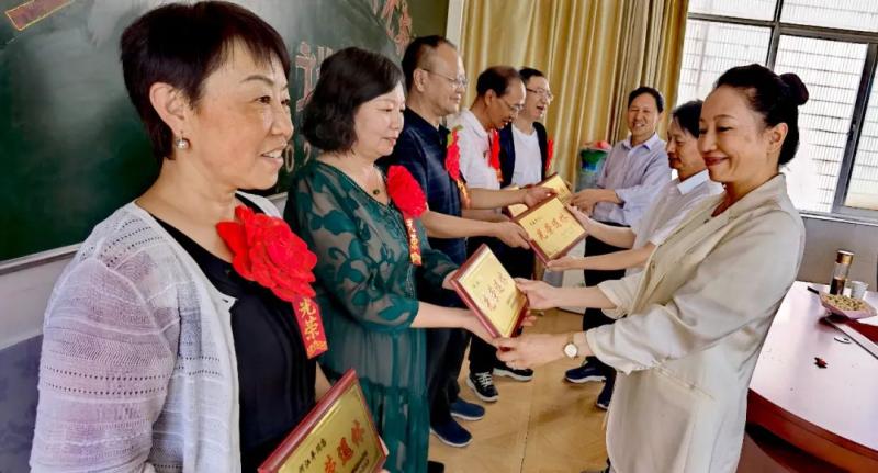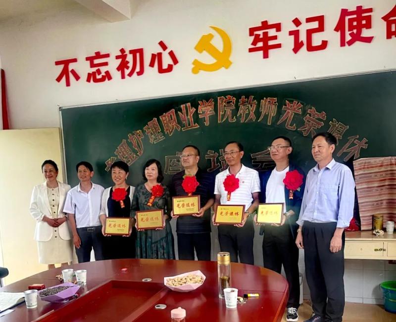 字利鹏、罗红伟、李洁三位学校领导,为退休职工佩戴了红花、颁发“光荣退休”纪念牌。