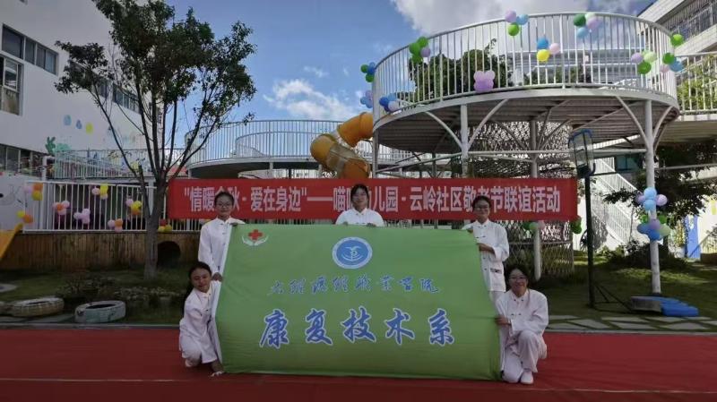金风送爽,菊黄桂香,10月29日重阳节,beat365vip官网登录入口康复技术系由陆艳萍老师带队,组织学生走进大理市喵喵幼儿园举办的云岭社区敬老节联谊活动现场,用实际行动践行医学服务社会、专业赋能民生的初心使命,为老人们带来了一场别开生面的健身气功八段锦现场教学、体验活动。