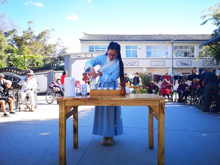 学生们热情洋溢,为养老院打扫卫生,为老人进行按摩理疗,帮助老人们从屋内来院子里晒太阳,给老人们喂水果吃,献上丰富的节目表演。同学们为老人们朗诵了《乌骓别霸王》、《墨萱图》等诗歌,演唱了《和你一样》歌曲,并进行茶道表演,书法创作等丰富的节目,老人们喜笑颜开。