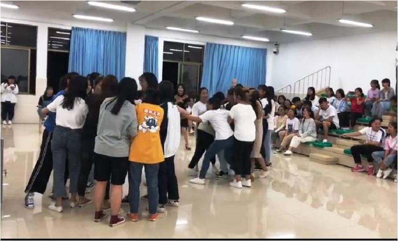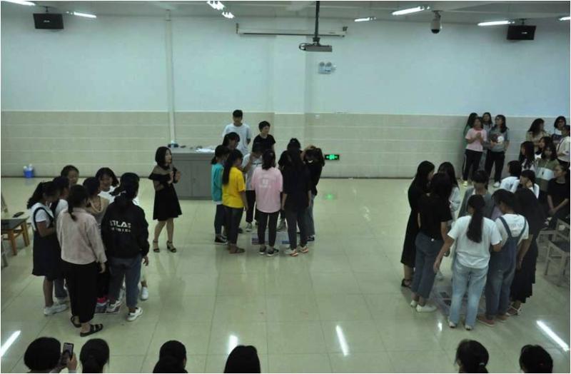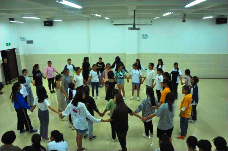 开展了“随机指定人数抱团”的游戏。同学按自己的随机序号围成一个圆圈,沿顺时针方向慢走,主持人点到序号的同学立即与临近同伴按所点序号抱团,最后剩下没有抱团成功的同学淘汰出局。其意义在于培养同学们的团队意识,在体验中感知确立目标,结伴而行才能成功的意义。