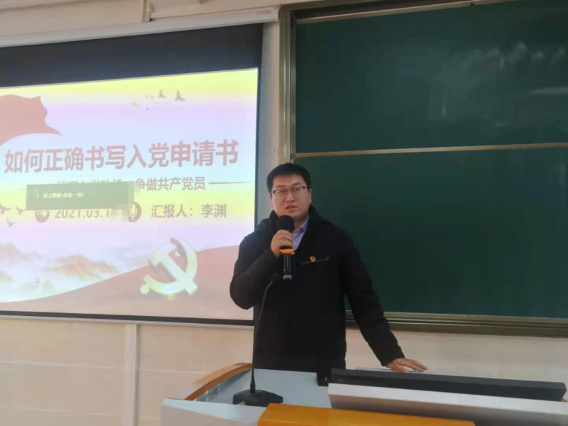 第二议程,由中共党员李渊老师就“如何正确书写入党申请书”进行讲解,通过对入党动机、入党条件、入党申请书的正确书写方式等方面进行的详细讲解,使大家深入了解党的性质、纲领、指导思想、宗旨、任务、组织原则和纪律,了解党员的义务和权利,了解发展党员工作的基本程序和要求,最后求同学们增强入党的自觉意识,提高理论水平,端正入党动机,坚定理想信。