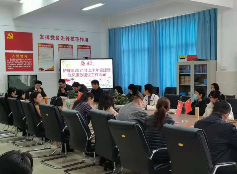为深入推进全面从严治党,扎实做好2021年度党风廉政建设工作,落实全面从严治党主体责任,3月11日下午护理系召开了“护理系2021年上半年党建暨党风廉政建设工作会议”,参会人员有王荣富书记、郭太兵主任、及护理系全体教师,会议由袁秀林书记主持。