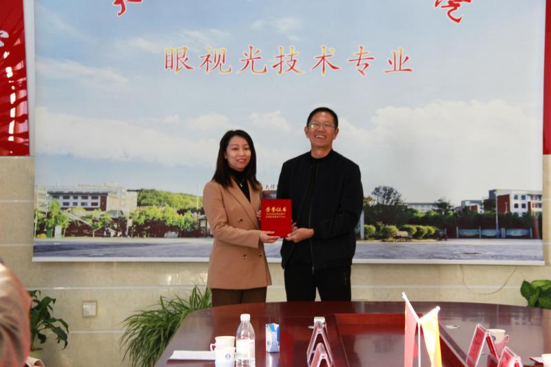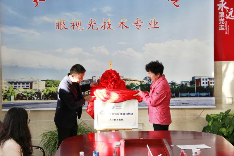 廖惠群书记与郑鹏经理为“普诺瞳角膜接触镜人才培养基地”揭牌;蔡德周院长向爱博诺德(北京)医疗科技股份有限公司颁发捐赠证书;郭向周副院长和邢菲主管签订了“校企合作”协议,并向徐俊锋经理和刘佳琪主管颁发“beat365vip官网登录入口兼职教师”聘书。