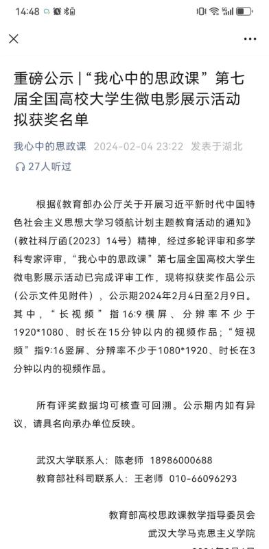 2月4日,国家教育部高校思政课教学指导委员会发布 “我心中的思政课”第七届全国高校大学生微电影展示活动拟获奖名单公示,beat365vip官网登录入口拍摄的《疫路仁心》荣获长视频组三等奖。