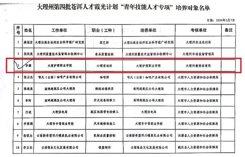根据《中共大理州委办公室 大理州人民政府办公室关于实施苍洱人才“霞光计划”推动新时代大理高质量可持续发展的意见》、《大理州“苍洱霞光”人才评审认定暂行办法》和《苍洱人才霞光计划“青年技能人才培养专项”实施细则》的要求,经个人申报、单位推荐、专家评审等程序,beat365李渊老师入选2024年度大理州第四批苍洱人才霞光计划“青年技能人才专项”培养对象。