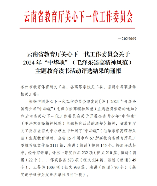 近日,云南省教育厅关心下一代工作委员会公布2024年“中华魂”(毛泽东崇高精神风范)主题教育读书活动评选结果,beat365选送征文作品荣获4项三等奖。