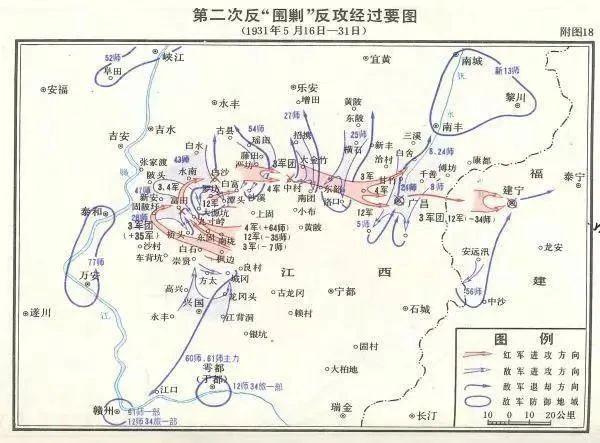 国民党军对红军第一次“围剿”失败后,蒋介石又派军政部长何应钦率20万兵力,采取“稳扎稳打,步步为营”的方针,于193141日向中央苏区发起第二次“围剿”,企图包围并消灭红一方面军主力于赣南。苏区中央局经过反复讨论,接受毛泽东的意见,决定仍采取“诱敌深入”的方针,将主力南移至广昌、宁都、石城地区,集中兵力,先打弱敌,然后自西向东横扫,各个歼灭敌人。国民党军在红军游击战袭扰下,行动缓慢。423日,红一方面军3万余人在毛泽东、朱德指挥下,转至龙冈、东固地区隐蔽集结。516日,红军突然发起攻击。531日,攻克福建建宁城。15天内,红军连打五次胜仗,自西向东横扫七百里,歼敌3万多人,粉碎了国民党军对中央苏区的第二次“围剿”,巩固和扩大了中央苏区。