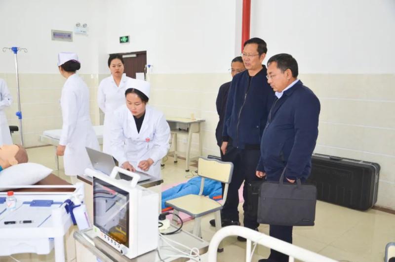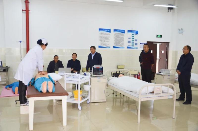 检查组一行一边深入学校健康驿站、学生宿舍、护理系费森尤斯校企合作血透模拟中心、护理系实验实训室、学校安全监控中心等场所进行实地查看,一边听取蔡德周院长的汇报,了解学校在党的二十大精神的贯彻落实、疫情防控、师德师风、校园安全、学校项目建设等各项工作的开展情况与进度规划。