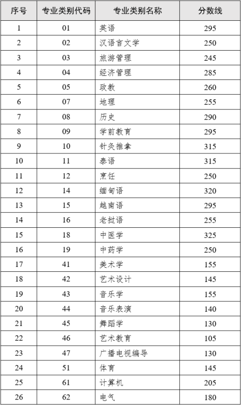 云南省2023年普通高等学校本科招收应届专科毕业生升学统一考试各专业类别最低录取控制分数线