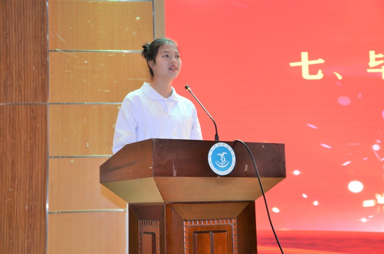 张雯红同学回顾了三年学习生活历程,对学校和老师三年的培育和教导表示感谢。她代表全体毕业生誓言:“以救死扶伤为信仰,以科学研究为追求,以公众健康为使命,努力成为一名优秀的医学健康守卫者而奋斗。”