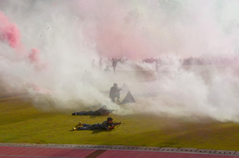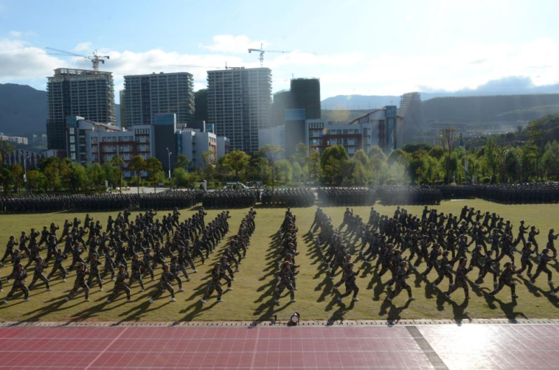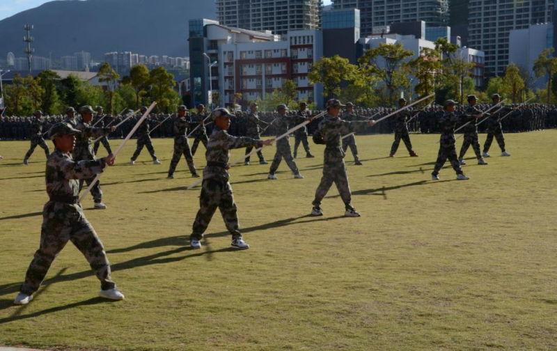 43个新生班级形成的21个军训连队依次从主席台前经过接受检阅,军体拳、应急操、刺杀操、战术演练、队列表演充分展示了此次军训所取得的优异成绩。