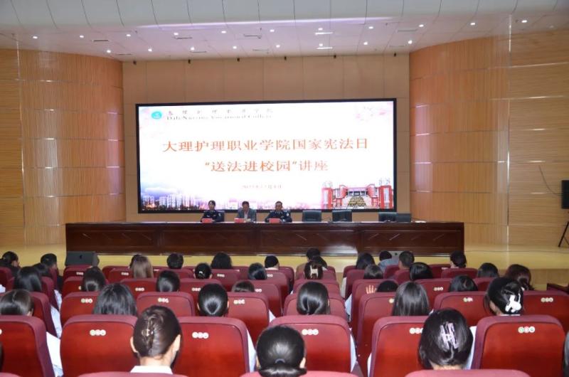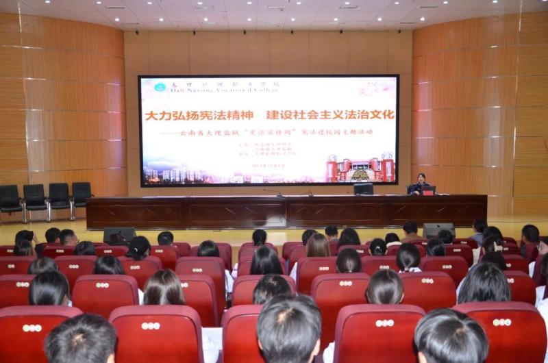12月4日,在第十个国家宪法日,beat365vip官网登录入口联合共青团大理州委和云南省大理监狱在学校第二报告厅开展主题为“大力弘扬宪法精神 建设社会主义法治文化”的“宪法宣传周 宪法进校园”主题活动。大理监狱政治处副主任李泽龙、警官李丹婷、学校教职员工和学生代表258人参加活动。学校党委专职副书记字利鹏主持活动。
