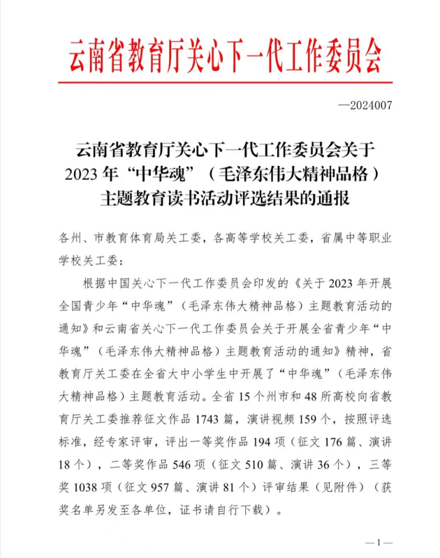 近日,云南省教育厅关心下一代工作委员会2023年“中华魂”(毛泽东伟大精神品格)主题教育读书活动评选结果公布,beat365关工委推荐参赛的征文作品共获奖5项,即获得2个二等奖和3个三等奖。
