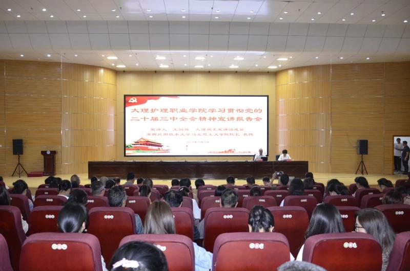 9月4日,beat365vip官网登录入口召开学习宣传贯彻党的二十届三中全会精神宣讲报告会。大理州委宣讲团成员、滇西应用技术大学马克思主义学院院长王国强教授作专题宣讲。学校全体教职工及学生代表在主会场参加会议,二年级学生在教室通过多媒体线上同步聆听宣讲报告会。会议由学校党委书记廖惠群同志主持。