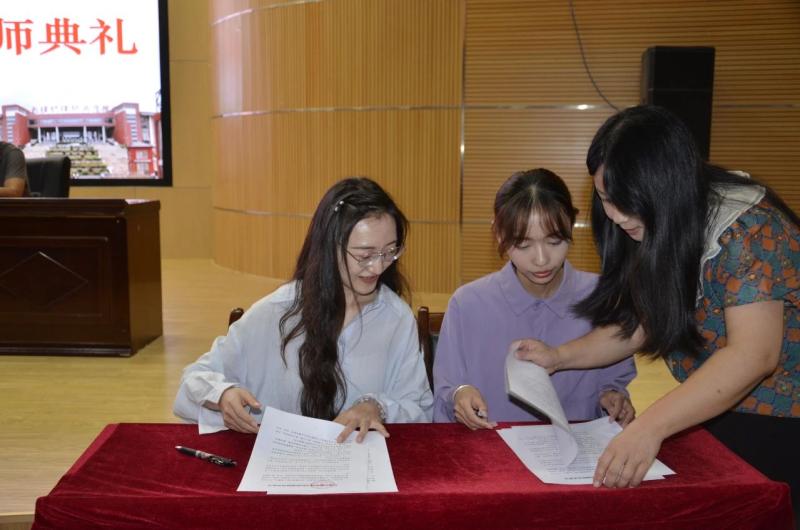 新入职教师代表胡彬玲、钱洋签订师德师风承诺书