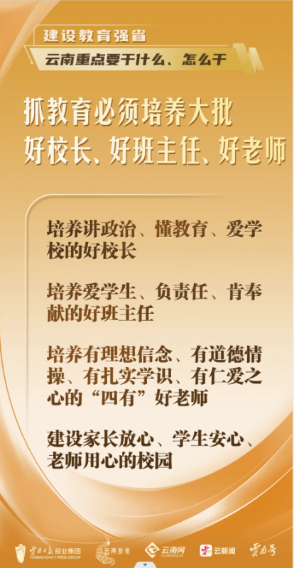 培养讲政治、懂教育、爱学校的好校长。一是树典型。省里每年选树10名“云岭好校长”,旗帜鲜明给予表扬奖励,宣传推广他们的教学和管理经验,发挥典型引路的作用。二是抓培训。继续实施万名校长培训计划,让“云岭好校长”传授办学治校经验;每年选派一批校长、副校长和后备人才,到省内外办得好的中小学校跟岗学习。三是建机制。对干得好的校长,要舍得给荣誉、给待遇、给平台,激励他们干事创业。要选优配强学校党组织书记,抓好学校党建,使学校党组织成为广大师生最贴心、最信赖的组织依靠。