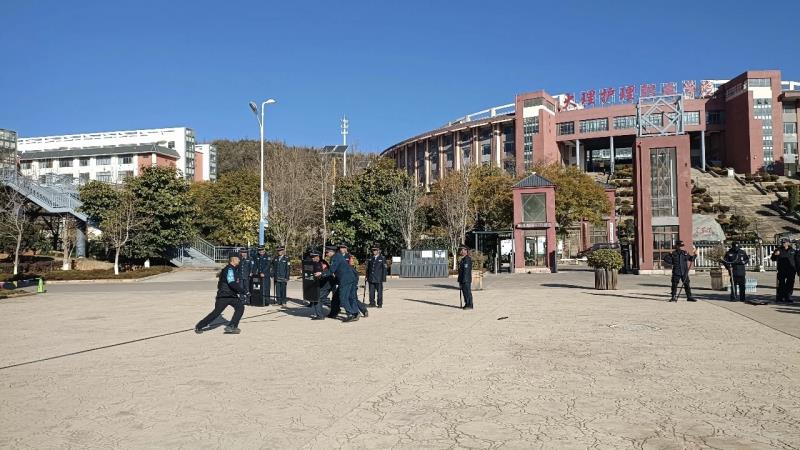 演练模拟“暴徒”持刀闯入校园的场景。保安人员迅速启动应急预案,手持装备与“歹徒”周旋,辖区派出所、巡特警大队接到报警后,快速赶到现场将“暴徒”制服。演练结束,大理市巡特警大队对保安人员就校园反恐防暴培训作了系统、全面的指导培训,详细讲解了反恐防暴技能和应对方法,对防暴盾牌、钢叉、胶棍等警械装备使用作了手把手的指导。