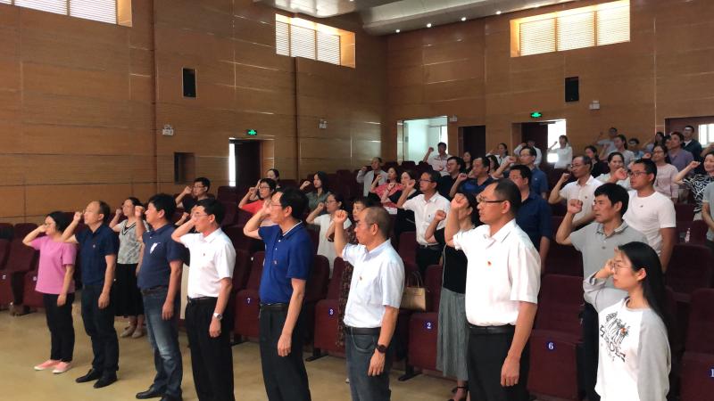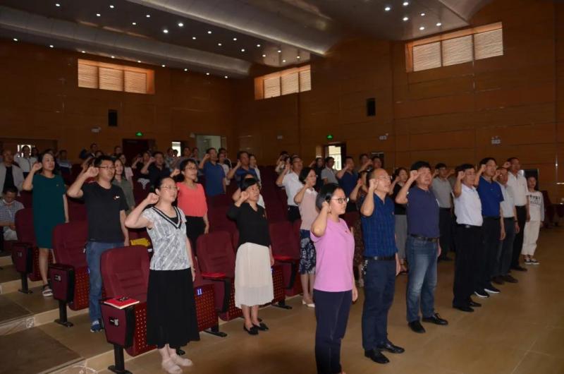 院党委书记王荣富领誓,全体党员重温入党誓词,2名新党员面向鲜红的党旗宣誓。