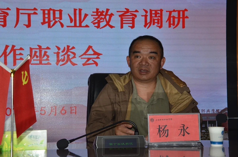 5月6日下午,云南省教育厅调研组职成教处副处长杨永一行到beat365vip官网登录入口专题调研学院职业教育发展工作,听取学院工作情况汇报。大理州教体局局长杨文泽、副局长字有发、职教科科长李云鹏和学院党委书记王荣富、院长蔡德周、党委专职副书记字利鹏,副院长陈跃祥、石龙富陪同调研。