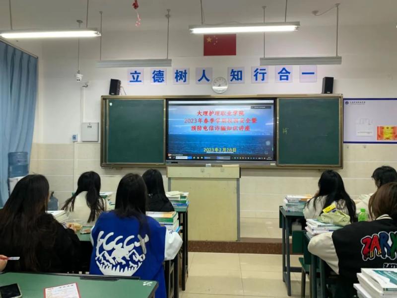 2月28日,为进一步加强校园安全和预防电信诈骗宣传教育,建设平安校园,学校开展“开学第一课”,邀请大理市公安局海东新区派出所所长刘硕警官,为全校师生开展线上校园安全暨防范电信诈骗知识讲座。全体在校班级学生通过各班教室多媒体认真聆听了讲座。