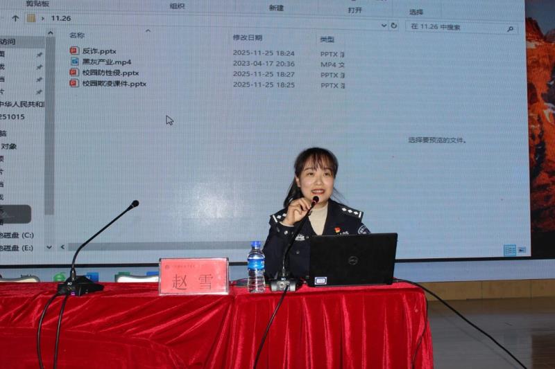 11月26日,beat365vip官网登录入口特邀大理市公安局刑侦大队新型网络犯罪侦查中队民警赵雪,为全校师生带来一场主题鲜明、内容翔实的预防电信诈骗暨安全法制教育专题讲座。进一步强化校园安全防线,提升学生法治观念与自我保护能力,营造平安和谐的育人环境。讲座由学生科副科长张小蓉老师主持,全校3900余名师生在第一报告厅和班级教室,通过线上线下聆听了讲座。