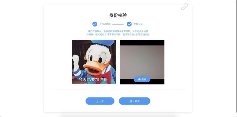 考试前 30 分钟内均可进行身份验证,请同学提前准备好身份证正面照片,并按要求上传证件照、进行拍照认证,摄像头拍照后,即可进入考试。
