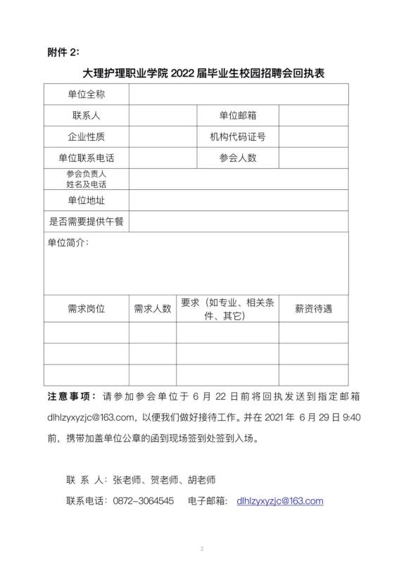 2.请按附件2认真填写的《beat365vip官网登录入口2022届毕业生招聘单位回执表》并于2022年6月26日前将回执以电子邮件形式发送至dlhlzyxyzjc@163.com,以便我们安排展位。