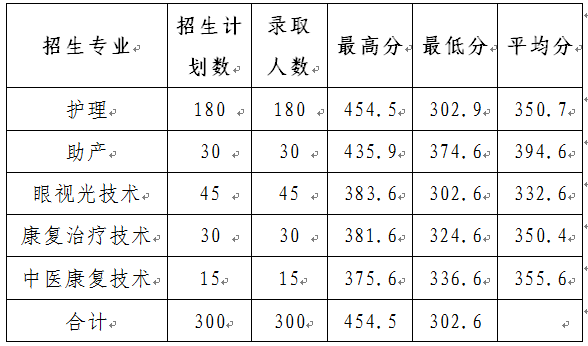 2017年8月1日beat365vip官网登录入口高职专科“三校生”类300人录取全部结束,最高分454.5分,最低分302.9分,其中护理专业最低分302.9分,超控制线197.9分;助产专业最低分374.6,超控制线269.6分;眼视光技术专业最低分302.6分,超控制线107.6分;康复治疗技术最低分324.6分,超控制线129.6分;中医康复技术最低分336.6分,超控制线141.6分。录取结果为: