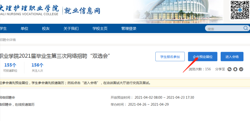 毕业生参会方式:登录护理职业学院就业信息网(网站网址:http://dlhlzyxy.jysd.com/),或扫描二维码登录。学生首次登录就业网,需要用学号和姓名进行注册,设置登录密码,见附件2。