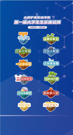 生涯体验周是目前国内职业生涯教育领域特有的的新型的教育形式,是大学生职业生涯规划课程的有效延伸和有益补充,唤醒学生生涯规划意识,帮助学生制定科学有效的职业生涯规划方案是生涯体验周核心价值所在。本活动设置四大主题区域,十一个活动关卡,以线上线下结合模式开展,旨在通过游戏参与、动感体验、深入探索等一系列活动,唤起大学生的生涯规划意识,积极追求的力量。