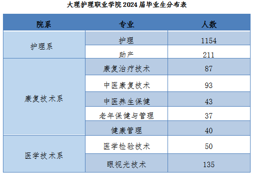 beat3652024届有护理、助产、医学检验技术、眼视光技术、健康管理、康复治疗技术、中医康复技术、中医养生保健及老年保健与管理9个专业高职专科毕业生共1850人,具体专业分布如下表: