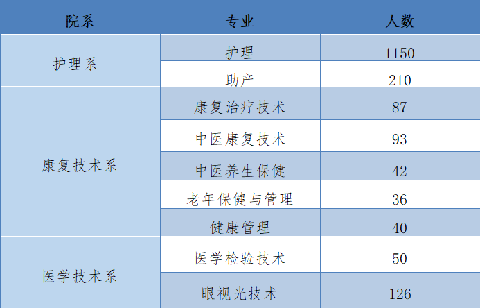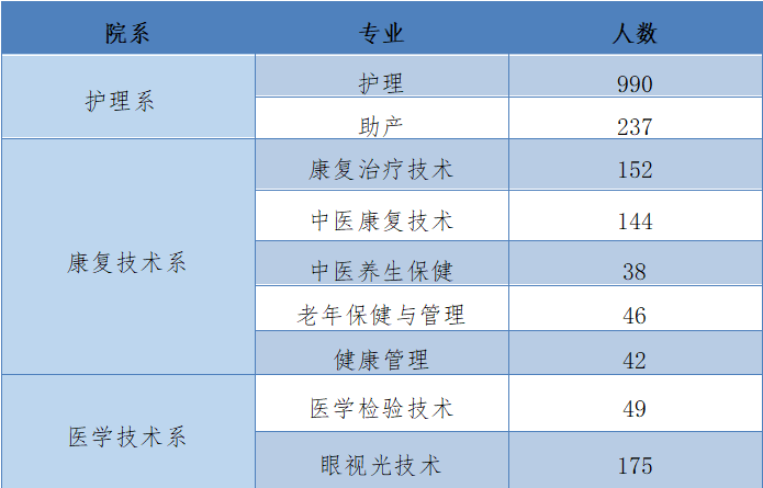beat3652024届有护理、助产、医学检验技术、眼视光技术、健康管理、康复治疗技术、中医康复技术、中医养生保健及老年保健与管理9个专业高职专科毕业生共1834人,具体专业分布如下表: